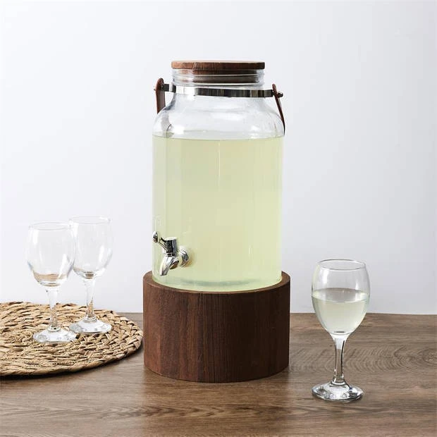 Een grote dispenser van helder glas. De dispenser heeft een deksel en een metalen tapkraan. Diameter 18 cm, hoogte 24,5 cm. Maak een feestje op je eigen terras met deze chique dispenser. Vul de kan met water of limonade en stukjes fruit naar eigen keuze. Denk aan schijfjes citroen & limoen, blauwe bessen, frambozen, muntbladeren en stukjes gember. Zet de dispenser met tap daarna op tafel en laat iedereen zelf zijn eigen fruitwater tappen. De kan heeft geribbeld glas en een gouden deksel en tapje. Via de deksel is de limonadetap makkelijk bij te vullen. De inhoud is 5 liter.