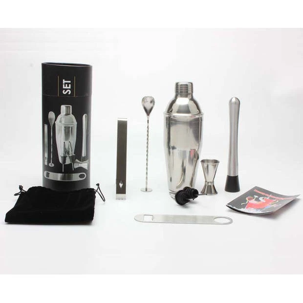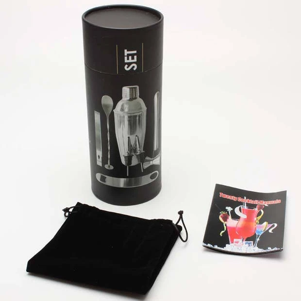 > Inhoud Set: Rvs Cocktail Shaker, maatbeker, ijsblokjestang, cocktaillepel met cocktail stamper, 2x flessen schenktuit, flessenopener, cocktail stamper