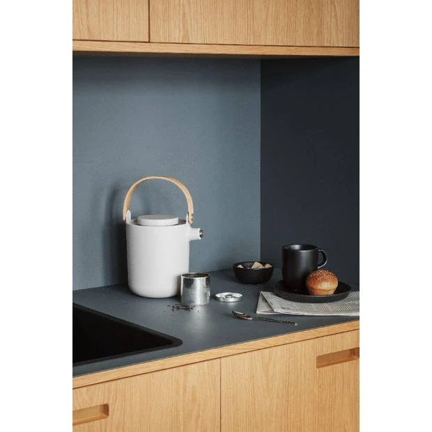 Strakke, moderne lijnen in combinatie met een natuurlijk bamboe accent. Dat is waar je de Nordic Kitchen thermoskan van Eva Solo aan kan herkennen. Het ontwerp is geïnspireerd op een theepot en onderscheid zich hiermee, mede dankzij de geïntegreerde theefilter, van de traditionele thermoskannen voor koffie. Vul de thermoskan met heet water en vul de theefilter met theeblaadjes welke je in het hete water kan laten trekken. De theefilter is eenvoudig te verwijderen wanneer de gewenste thee sterkte bereikt is. Het dubbelwandige RVS en kunststof zorgt, in combinatie met de deksel, voor een vacuüm geïsoleerde omgeving waardoor de thee urenlang warm blijft. Verder is de thermoskan 100% drupvrij wat vlekken op de tafel voorkomt. Na gebruik is de thermoskan eenvoudig schoon te spoelen onder de kraan waarna je de handgreep naar beneden kunt klappen om kastruimte te besparen. Omdat de handgreep is gemaakt van bamboe is het aan te raden om deze regelmatig in te smeren met olie om hem zo lang mogelijk in goede conditie te houden.